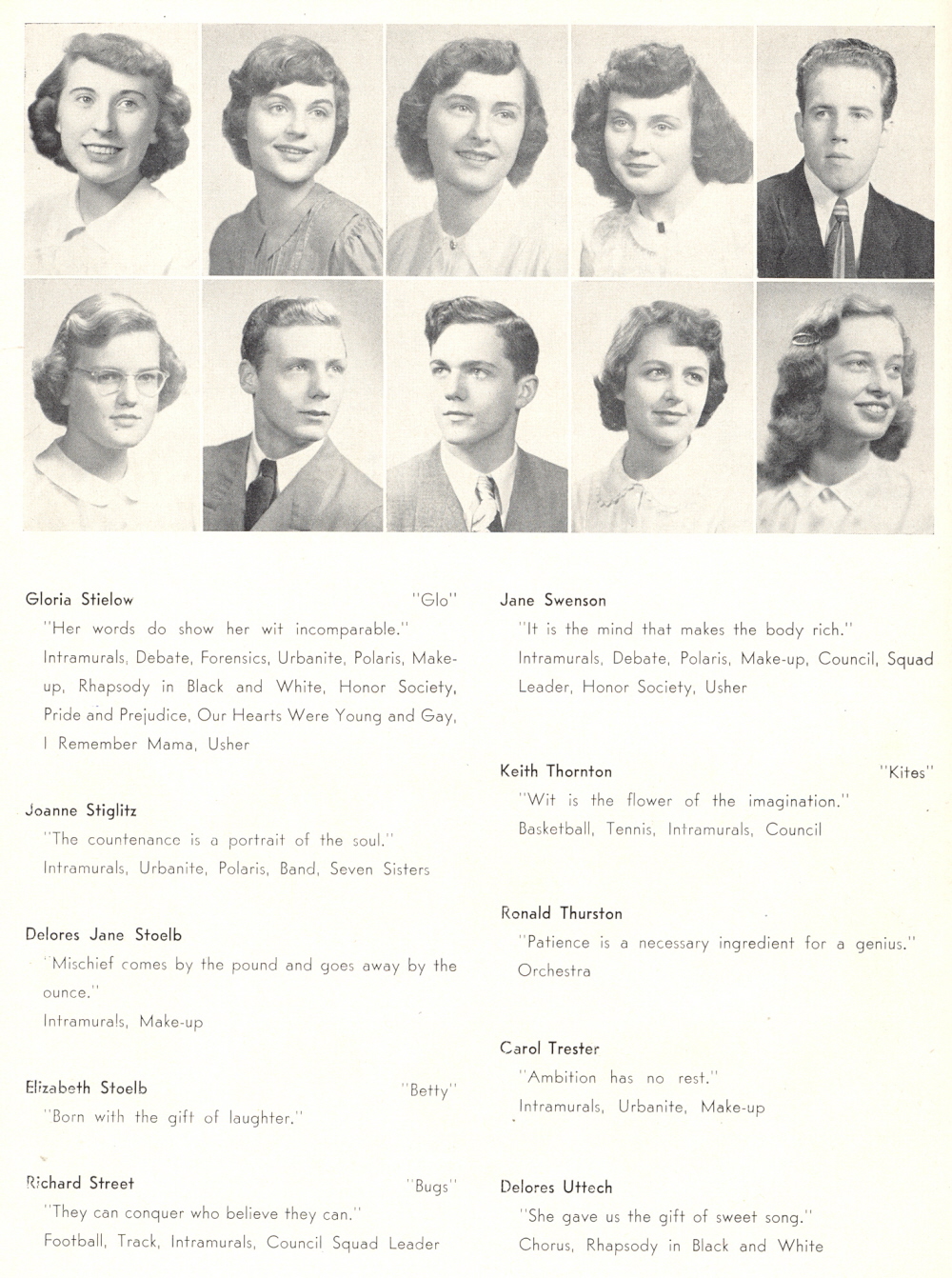 1949 Sheboygan North High School, Page 42: Gloria Stielow, Joanne Stiglitz, Delores Stoelb, Elizabeth Stoelb, Richard Street, Jane Swenson, Keith Thornton, Ronald Thurston, Carol Trester, Delores Uttech.