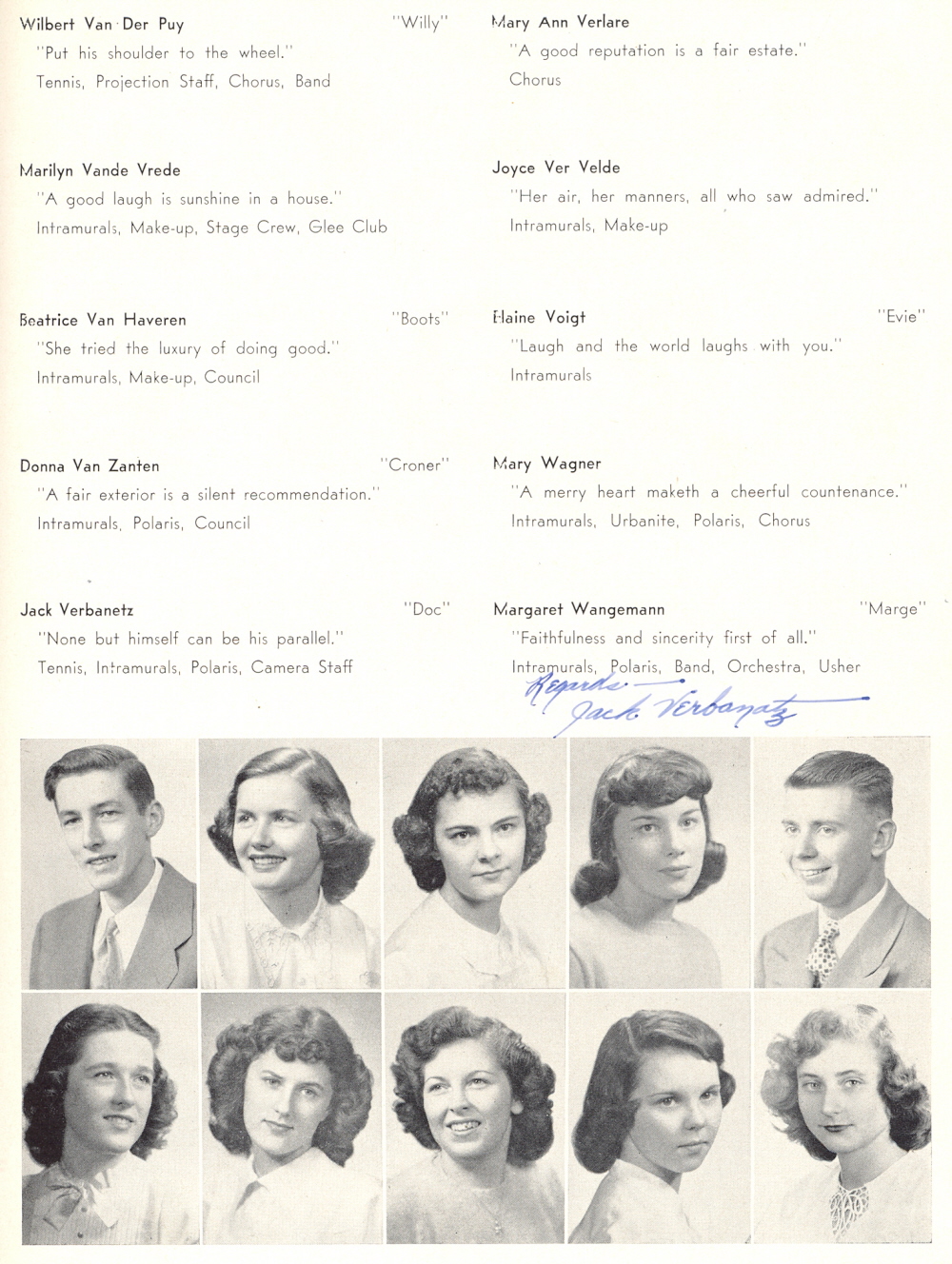 1949 Sheboygan North High School, Page 43: Wilbert Van Der Puy, Marilyn Vande Vrede, Beatrice Van Haveren, Donna Van Zanten, Jack Verganetz, Mary Verlare, Joyce Ver Velde, Elaine Voigt, Mary Wagner, Margaret Wangemann.