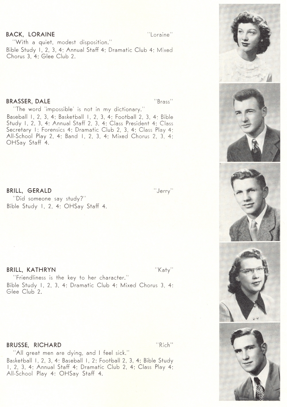 1950 Oostburg High School, Page 13: Loraine Back, Dale Brasser, Gerald Brill, Kathryn Brill, Richard Brusse.