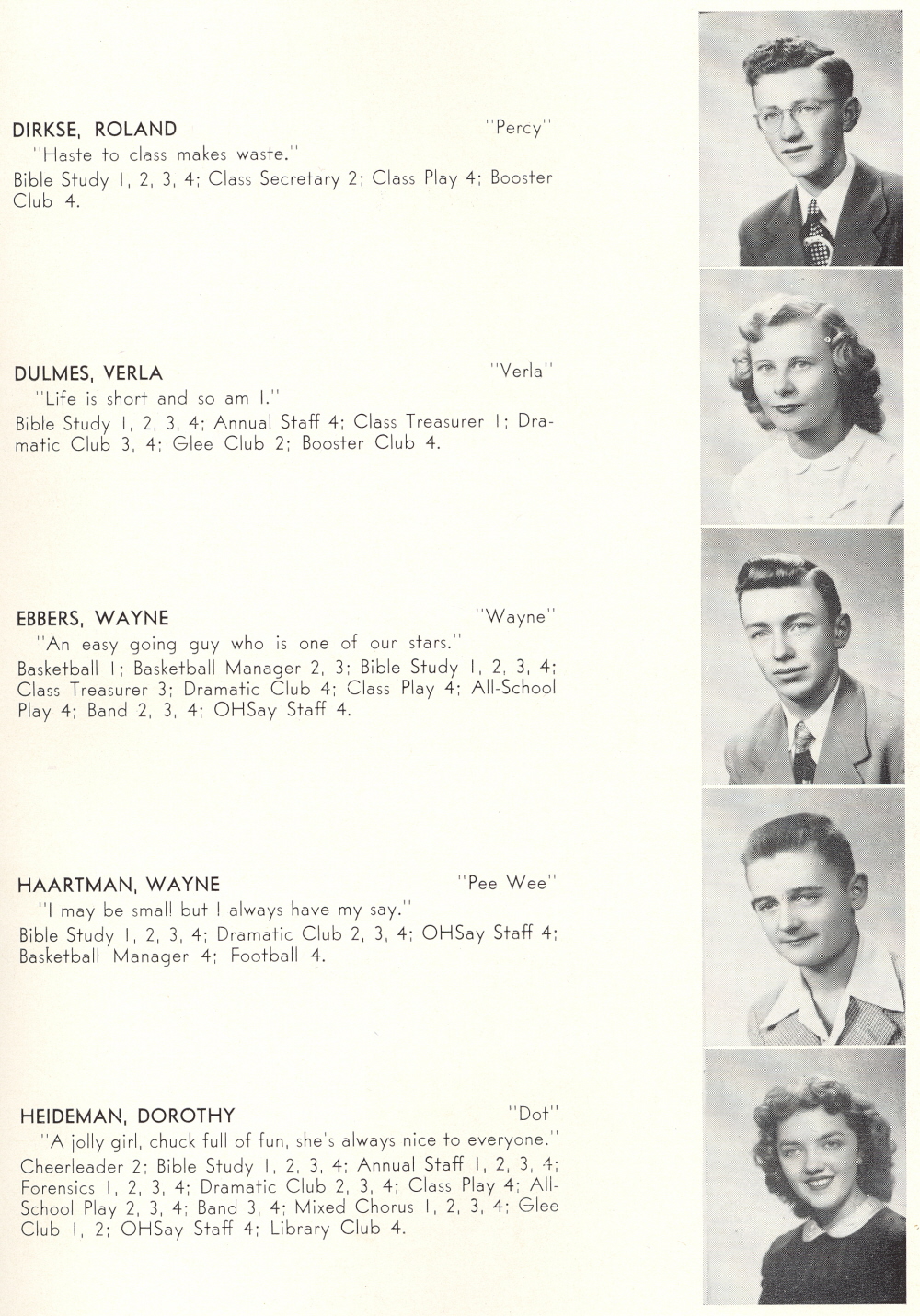 1950 Oostburg High School, Page 15: Roland Dirkse, Verla Dulmes, Wayne Ebbers, Wayne Haartman, Dorothy Heideman.