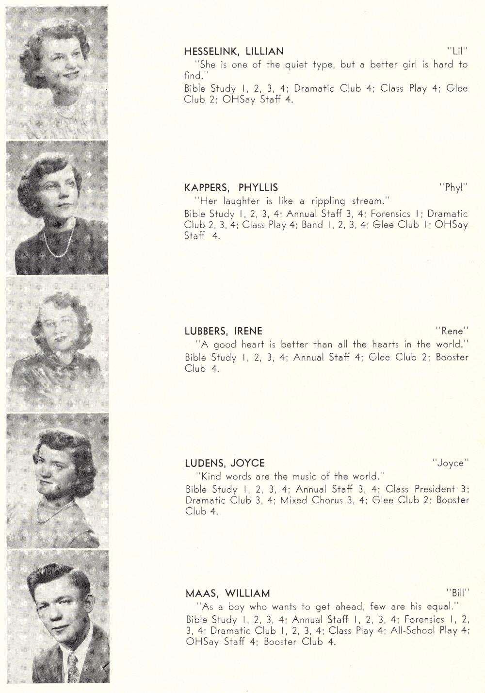 1950 Oostburg High School, Page 16: Lillian Hesselink, Phyllis Kappers, Irene Lubbers, Joyce Ludens, William Maas.
