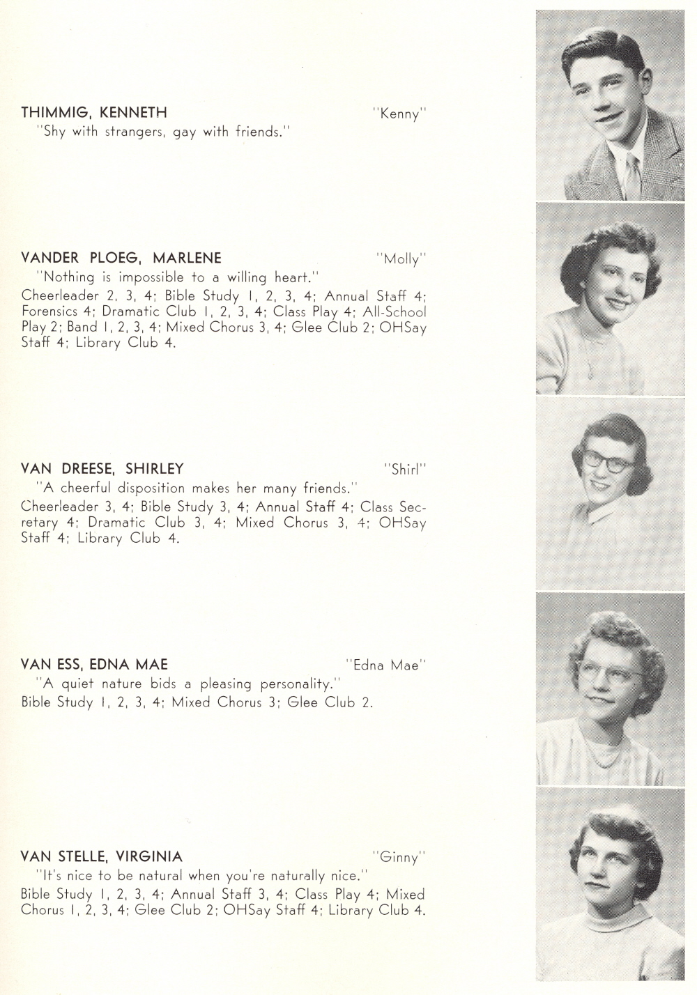 1950 Oostburg High School, Page 19: Kenneth Thimmig, Marlene Vander Ploeg, Shirley Van Dreese, Edna Mae Van Ess, Virginia Van Stelle.