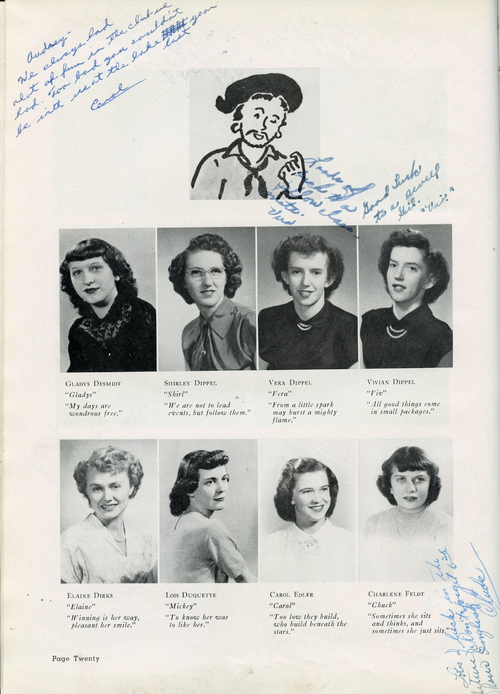 1950 Plymouth High School Yearbook Page 20: Gladys Desmidt, Shirley Dippel, Vera Dippel, Vivian Dippel, Elaine Dirks, Lois Duquette, Carol Edler, Charlene Feldt.