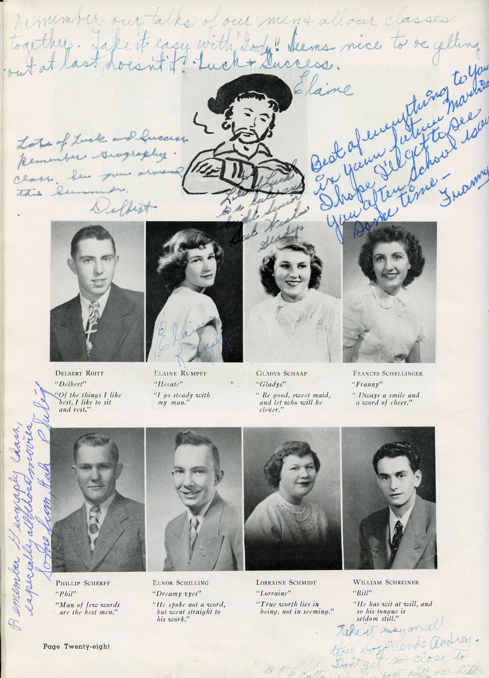 1950 Plymouth High School Yearbook Page 28: Delbert Roitt, Elaine Rumpff, Gladys Schaap, Ffrances Schellinger, Phillip Scherff, Elnor Schilling, Lorraine Schmidt, William Schreiner.