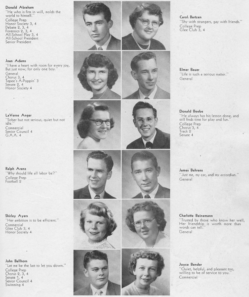 1950 Sheboygan Central High School, Page 19: Donald Abraham, Carol Bartzen, Joan Adams, Elmer Bauer, LaVerne Anger, Donald Beebe, Ralph Arenz, James Behrens, Shirley Ayers, Charlotte Beinemann, John Ballhorn, Joyce Bender.