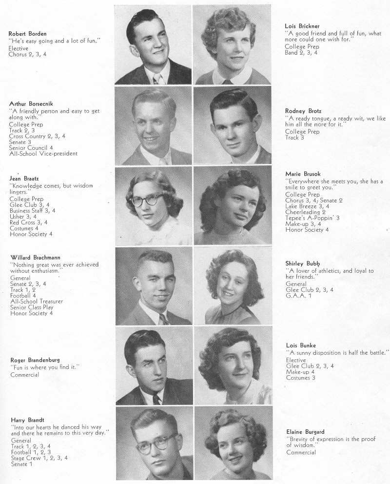 1950 Sheboygan Central High School, Page 21: Robert Borden, Lois Brickner, Arthur Borsecnik, Rodney Brotz, Jean Braatz, Marie Brusok, Willard Brachmann, Shirley Bubb, Roger Brandenburg, Lois Bunke, Harry Brandt, Elaine Burgard.