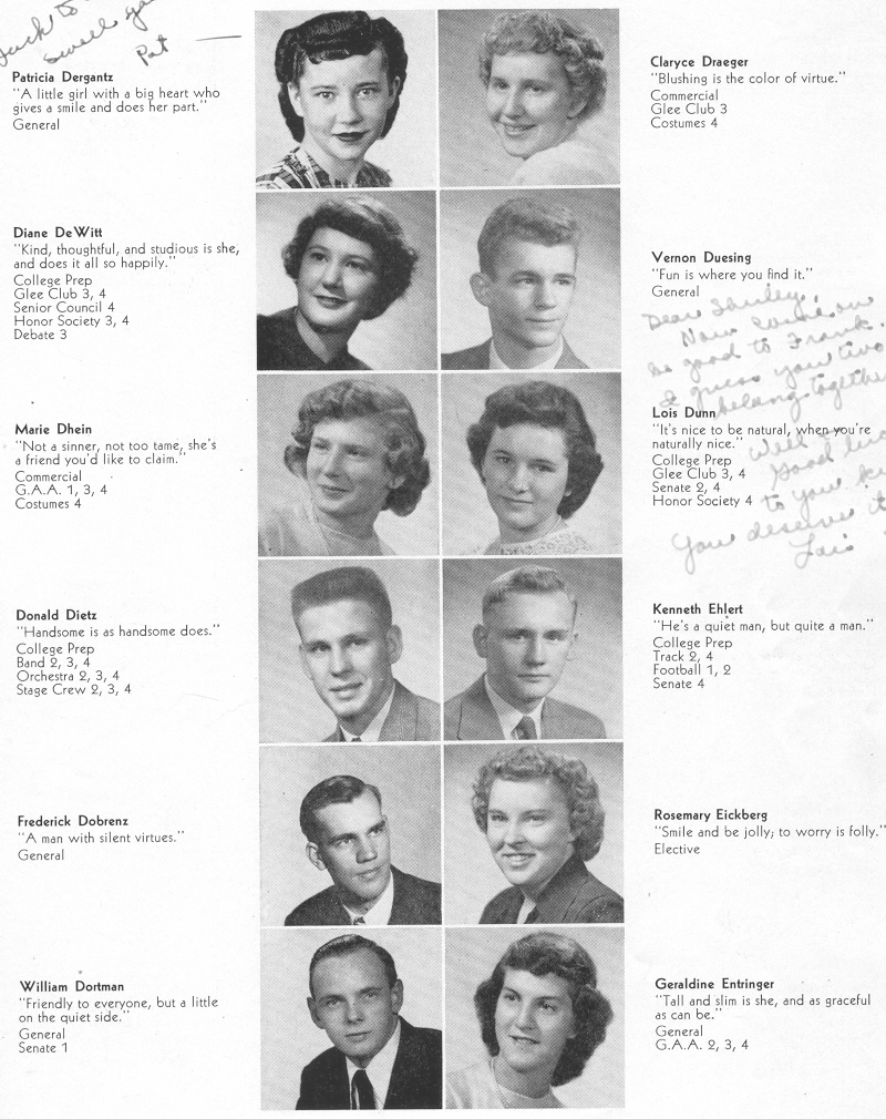 1950 Sheboygan Central High School, Page 23: Patricia Dergantz, Claryce Draeger, Diane DeWitt, Vernon Duesing, Marie Dhein, Lois Dunn, Donald Dietz, Kenneth Ehlert, Frederick Dobrenz, Rosemary Eickberg, William Dortman, Geraldine Entringer.