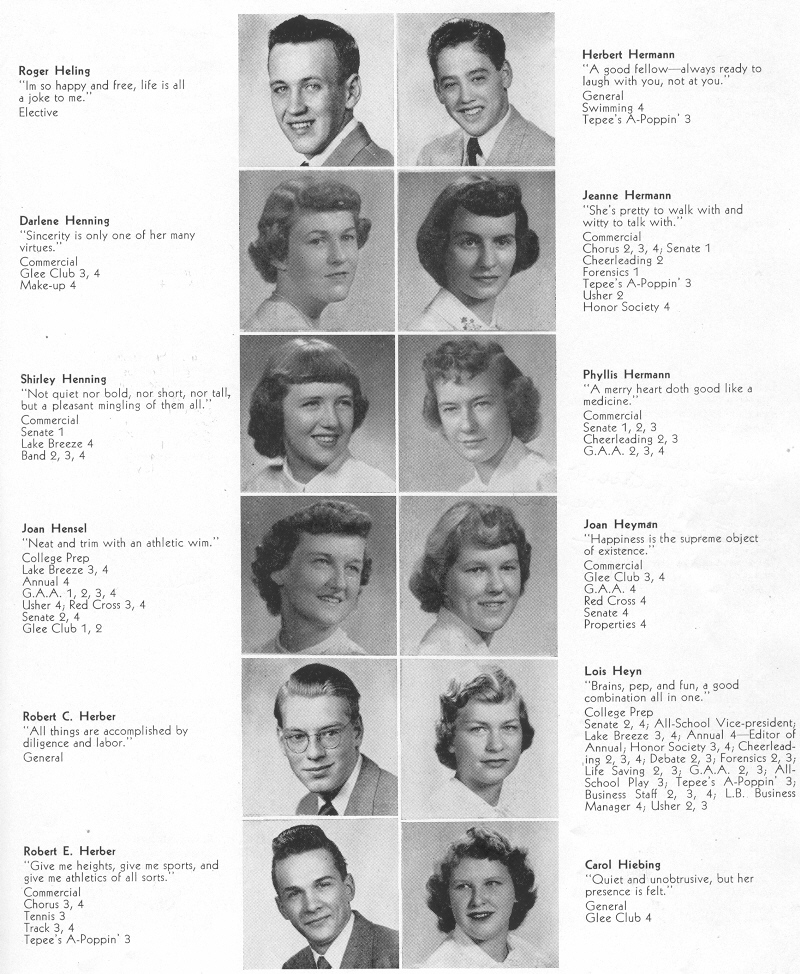 1950 Sheboygan Central High School, Page 27: Roger Heling, Herbert Hermann, Darlene Henning, Jeanne Hermann, Shirley Henning, Phyllis Hermann, Joan Hensel, Joan Heyman, Robert Herber, Lois Heyn, Carol Hiebing.