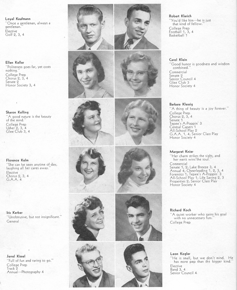 1950 Sheboygan Central High School, Page 30: Loyal Kaufmann, Robert Klarich, Ellen Keller, Carol Klein, Sharon Kelling, Barbara Klessig, Florence Kelm, Margaret Knier, Iris Kerber, Richard Koch, Jerrel Kissel, Leon Kogler.