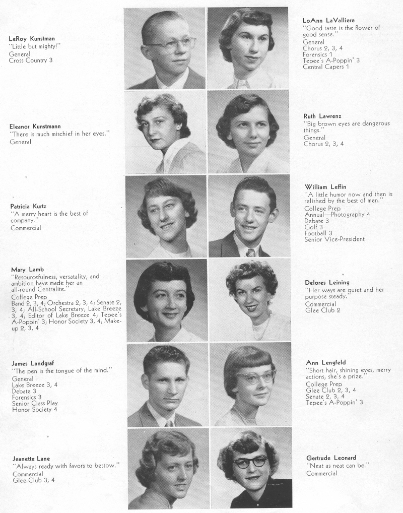 1950 Sheboygan Central High School, Page 32: LeRoy Kunstman, LoAnn LaValliere, Eleanor Kunstmann, Ruth Lawrenz, Patricia Kurtz, William Leffin, Mary Lamb, Delores Leining, James Landgraf, Ann Lengfeld, Jeanette Lane, Gertrude Leonard.