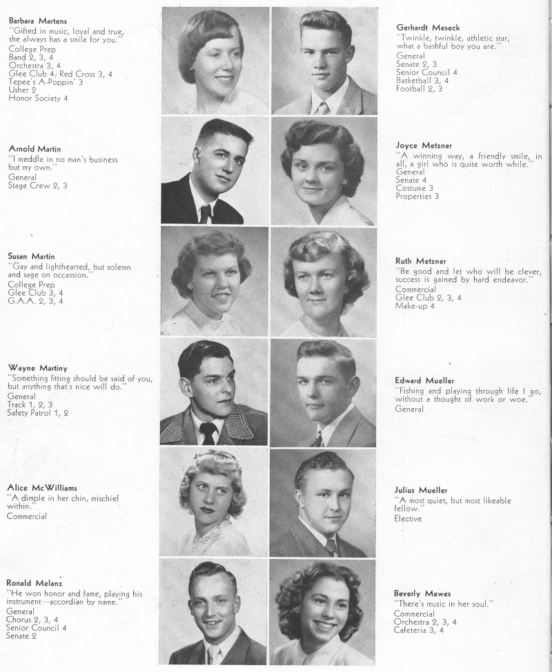 1950 Sheboygan Central High School, Page 34: Barbara Martens, Gerhardt Meseck, Arnold Martin, Joyce Metzner, Susan Martin, Ruth Metzner, Wayne Martiny, Edward Mueller, Alice McWilliams, Julius Mueller, Ronald Melanz, Beverly Mewes.