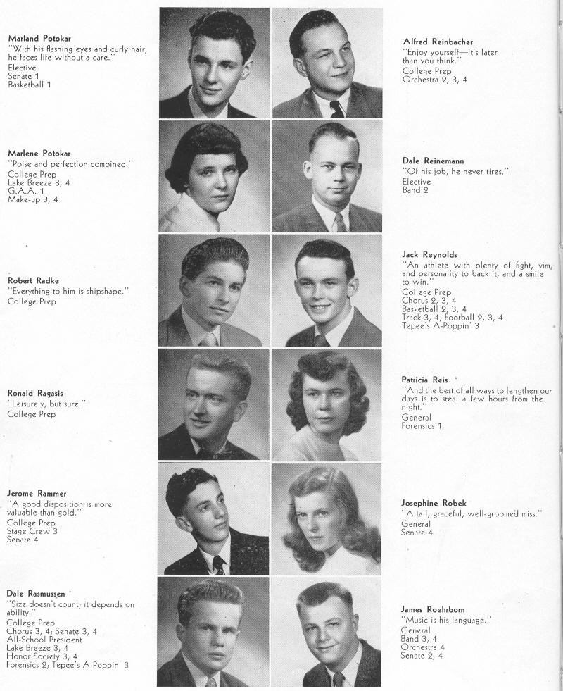 1950 Sheboygan Central High School, Page 38: Marland Potokar, Alfred Reinbacher, Marlene Potokar, Dale Reinemann, Robert Radke, Jack Reynolds, Ronald Ragasis, Patricia Reis, Jerome Rammer, Josephine Robek, Dale Rasmussen, James Roehrborn.