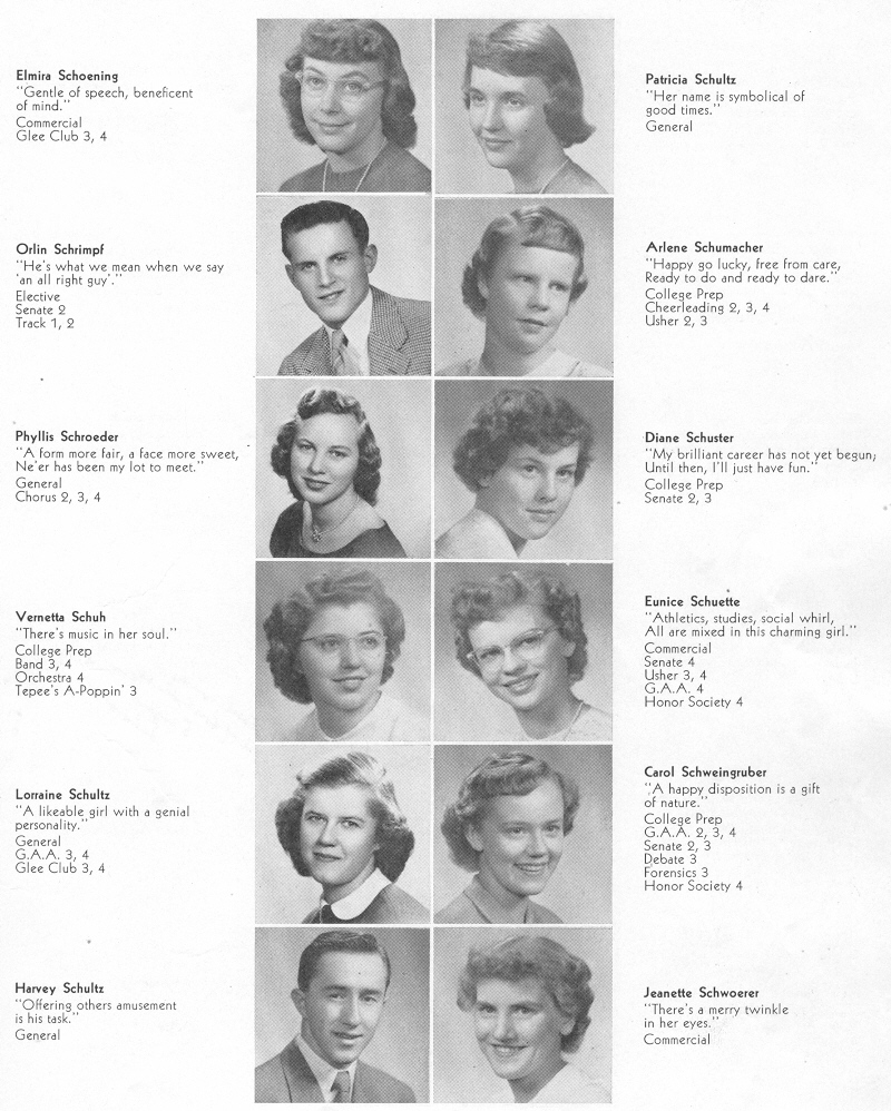 1950 Sheboygan Central High School, Page 41: Elmira Schoening, Patricia Schultz, Orlin Schrimpf, Arlene Schumacher, Phyllis Schroeder, Diane Schuster, Vernetta Schuh, Eunice Schuette, Lorraine Schultz, Carol Schweingruber, Harvey Schultz, Jeanette Schwoerer.