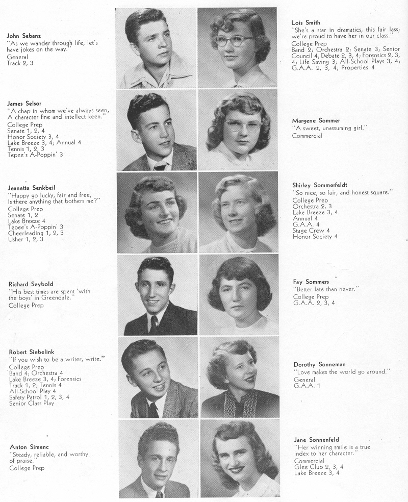 1950 Sheboygan Central High School, Page 42: John Sebanz, Lois Smith, James Selsor, Margene Sommer, Jeanette Senkbeil, Shirley Sommerfeldt, Richard Seybold, Fay Sommers, Robert Siebelink, Dorothy Sonneman, Anton Simenc, Jane Sonnenfeld.