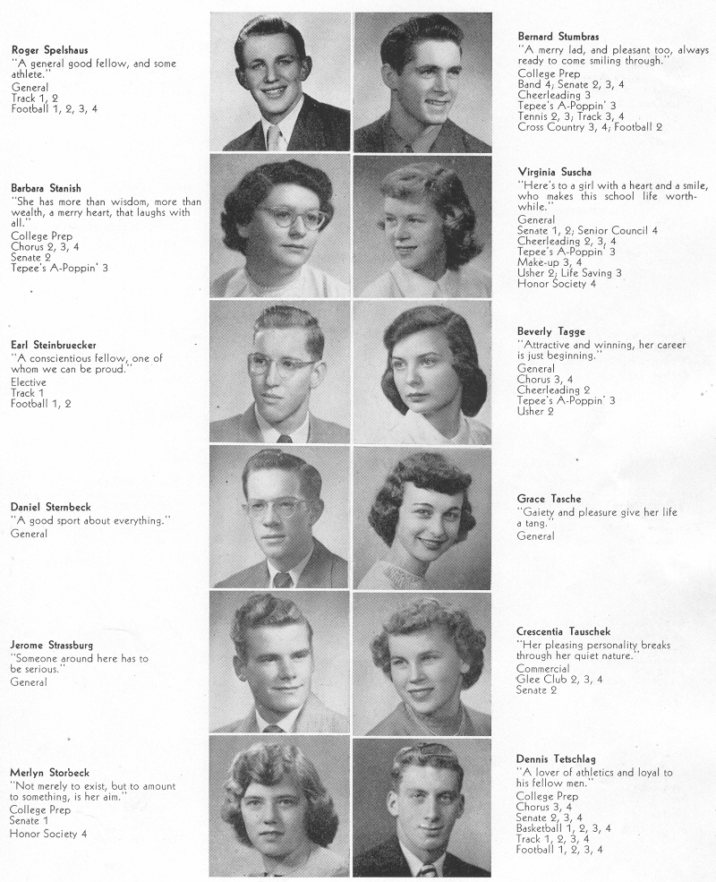 1950 Sheboygan Central High School, Page 43: Roger Spelshaus, Bernard Stumbras, Barbara Stanish, Virginia Suscha, Earl Steinbruecker, Beverly Tagge, Daniel Sternbeck, Grace Tasche, Jerome Strassburg, Crescentia Tauschek, Merlyn Storbeck, Dennis Tetschlag.