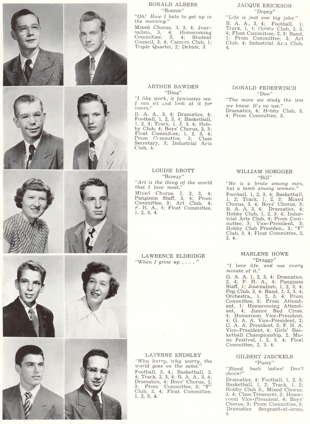 1950 Sheboygan Falls High School, Page 1: Ronald Albers, Jacque Erickson, Arthur Bawden, Donald Federwisch, Louise Brott, William Hoegger, Lawrence Eldridge, Marlene Howe, Laverne Endsley, Gilbert Jaeckels.