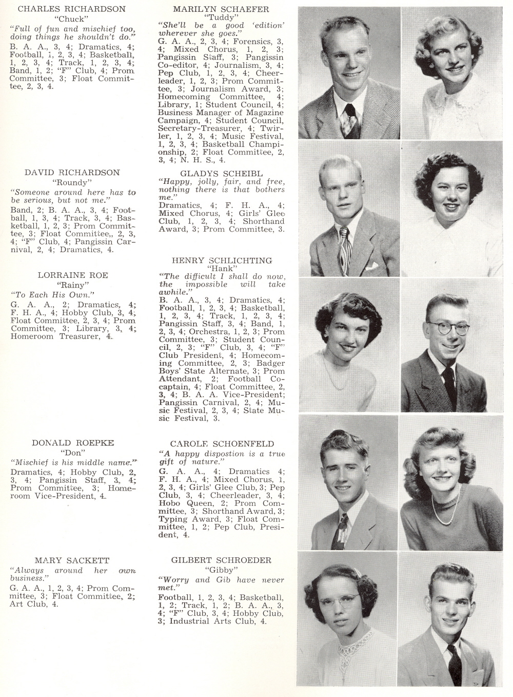 1950 Sheboygan Falls High School, Page 4: Charles Richardson, Marilyn Schaefer, David Richardson, Gladys Scheibl, Lorraine Roe, Henry Schlichting, Donald Roepke, Carole Schoenfeld, Mary Sackett, Gilbert Schroeder.