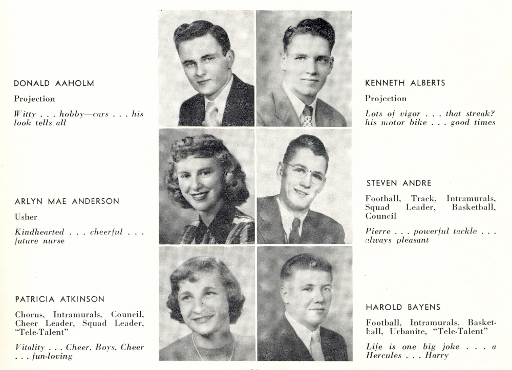 1950 Sheboygan North High School, Page 29: Donald Aaholm, Kenneth Alberts, Arlyn Mae Anderson, Steven Andre, Patricia Atkinson, Harold Bayens.
