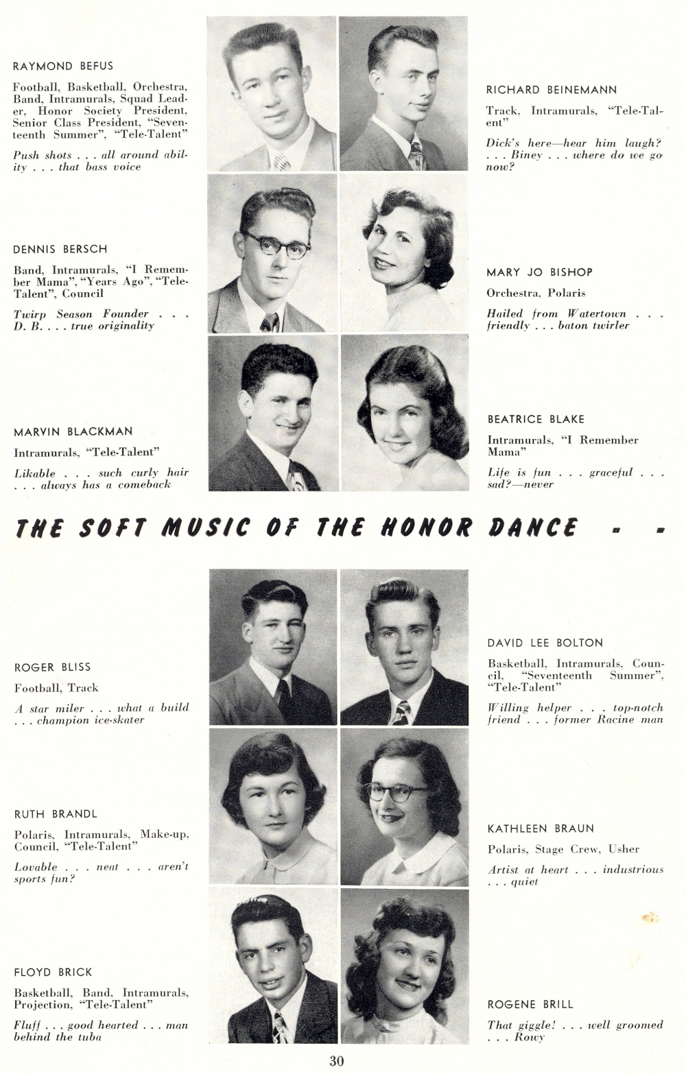 1950 Sheboygan North High School, Page 30: Raymond Befus, Richard Beinemann, Dennis Bersch, Mary Jo Bishop, Marvin Blackman, Beatrice Blake, Rober Bliss, David Bolton, Ruth Brandl, Kathleen Braun, Floyd Brick, Rogene Brill.