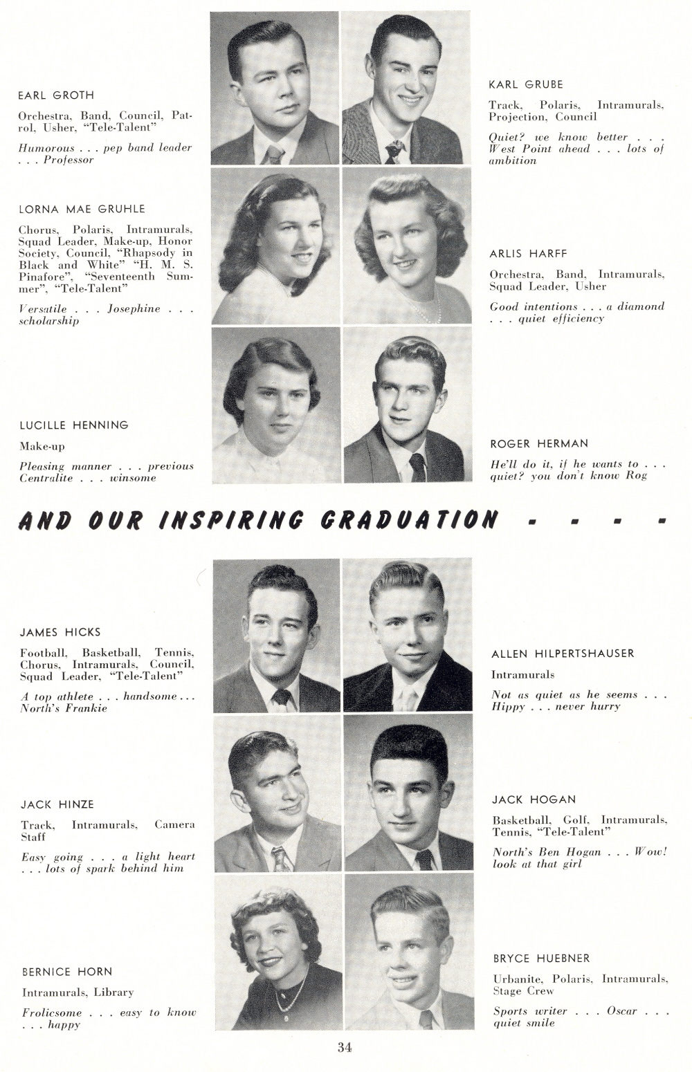1950 Sheboygan North High School, Page 34: Earl Groth, Karl Grube, Lorna Mae Gruhle, Arlis Harff, Lucille Henning, Roger Herman, James Hicks, Allen Hilpertshauser, Jack Hinze, Jack Hogan, Bernice Horn, Bryce Huebner.