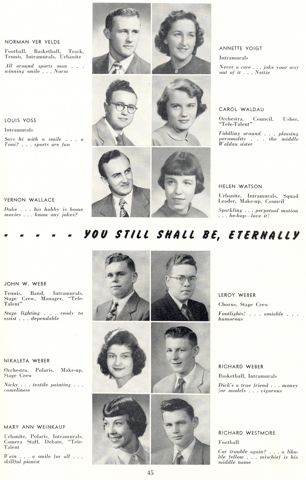 1950 Sheboygan North High School, Page 45: Norman Ver Velde, Annette Voigt, Louis Voss, Carol Waldau, Vernon Wallace, Helen Watson, John Webb, Leroy Weber, Nikaleta Weber, Richard Weber, Mary Ann Weinkauf, Richard Westmore.