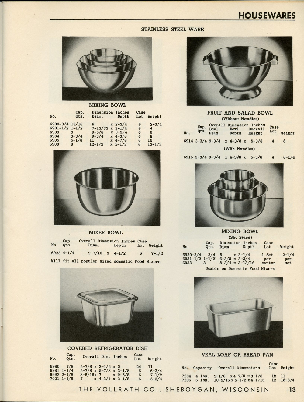 1950 Vollrath Catalog 75R Page 13: Mixing Bowl, Fruit and Salad Bowl, Mixer Bowl, Mixing Bowl, Covered Refrigerator Dish, Veal Loaf or Bread Pan.