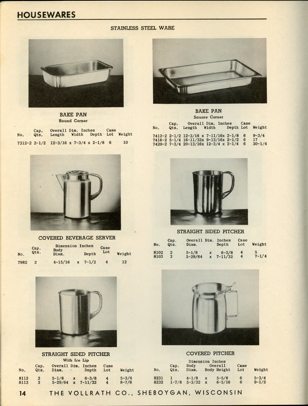 1950 Vollrath Catalog 75R Page 14: Bake Pan, Covered Beverage Server, Straight Sided Pitcher, Covered Pitcher.