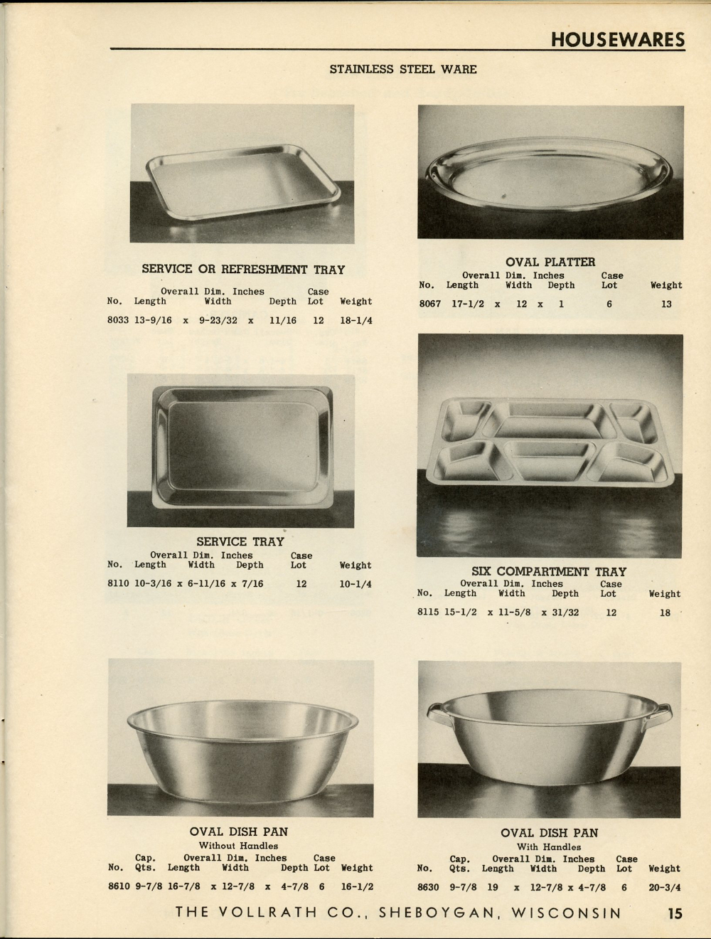 1950 Vollrath Catalog 75R Page 15: Service or Refreshment Tray, Oval Platter, Service Tray, Six Compartment Tray, Oval Dish Pan.