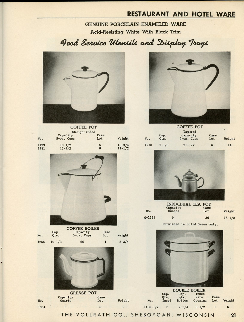 1950 Vollrath Catalog 75R Page 21: Coffee Pot, Coffee Boiler, Individual Tea Pot, Grease Pot, Double Boiler.