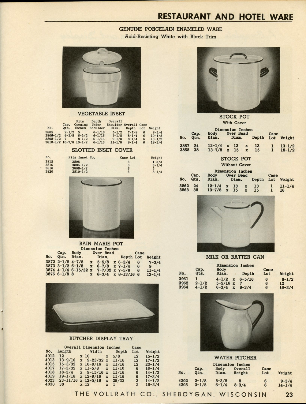 1950 Vollrath Catalog 75R Page 23: Vegetable Inset, Stock Pot, Slotted Inset Cover, Bain Marie Pot, Milk or Batter Can, Butcher Display Tray, Water Pitcher.