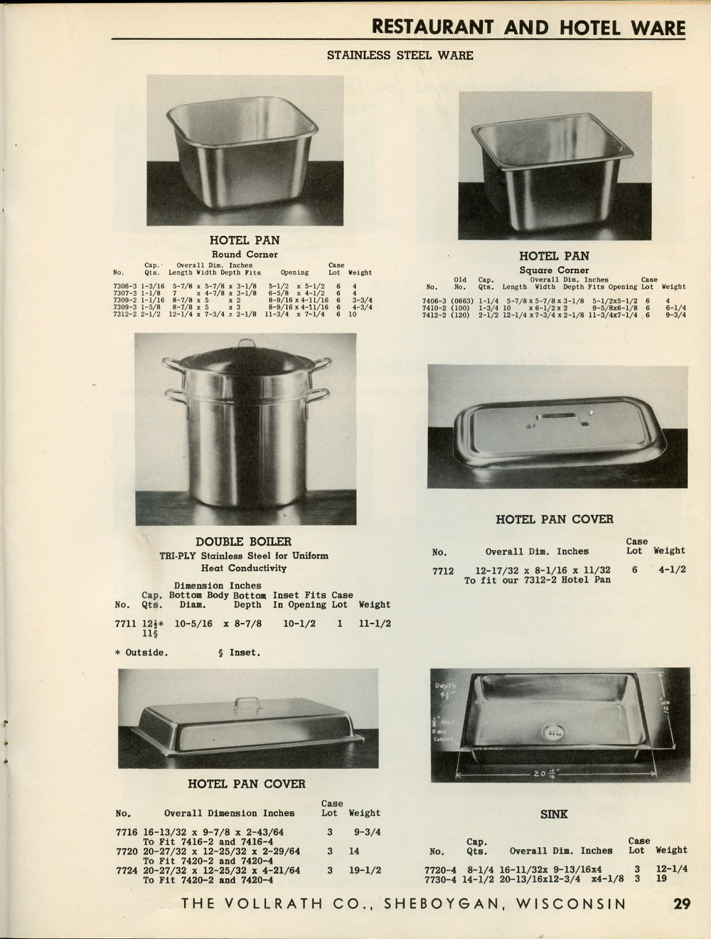 1950 Vollrath Catalog 75R Page 29: Hotel Pan, Double Boiler, Hotel Pan Cover, Sink.