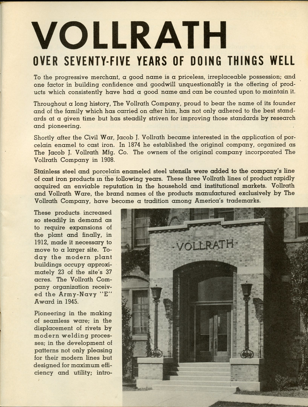 1950 Vollrath Catalog 75R Page 3: Vollrath History.