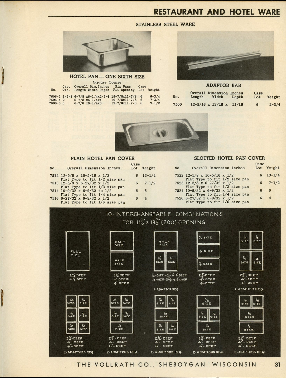 1950 Vollrath Catalog 75R Page 31: Hotel Pan--One Sixth Size, Adaptor Bar, Plain Hotel Pan Cover, Slotted Hotel Pan Cover.