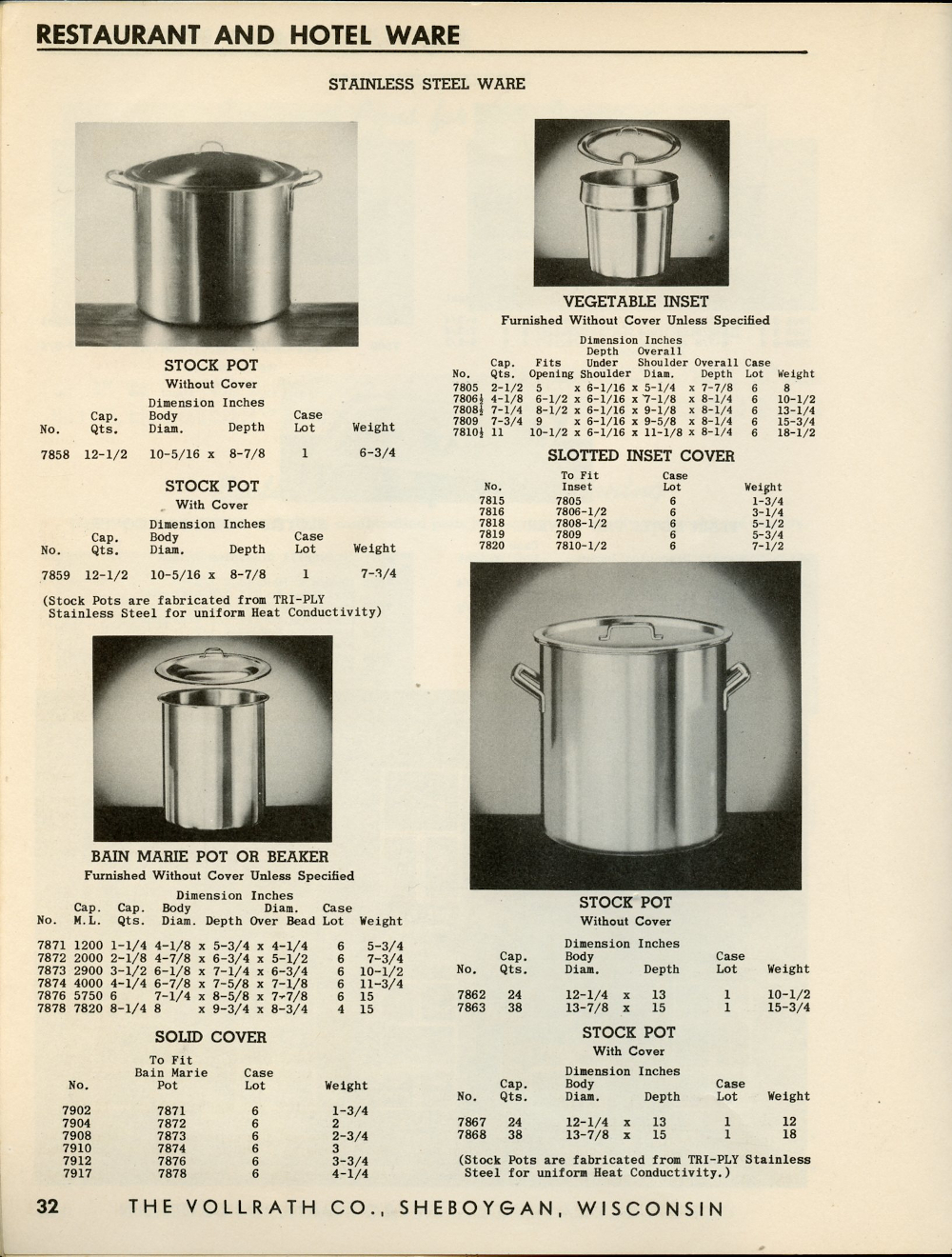 1950 Vollrath Catalog 75R Page 32: Stock Pot, Vegetable Inset, Slotted Inset Cover, Bain Marie Pot or Beaker, Solid Cover.