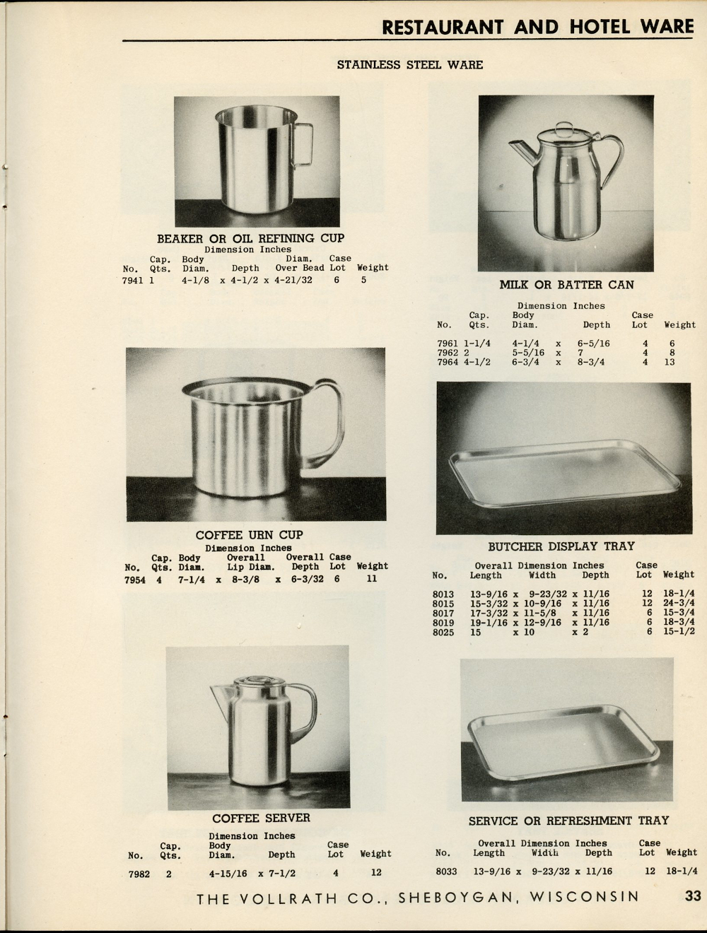1950 Vollrath Catalog 75R Page 33: Beaker or Oil Refining Cup, Milk or Batter Can, Coffee Urn Cup, Butcher Display Tray, Coffee Server, Service or Refreshment Tray.