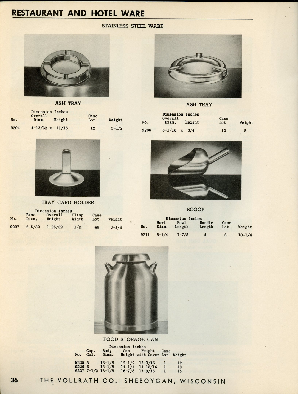 1950 Vollrath Catalog 75R Page 36: Ash Tray, Tray Card Holders, Scoop, Food Storage Can.