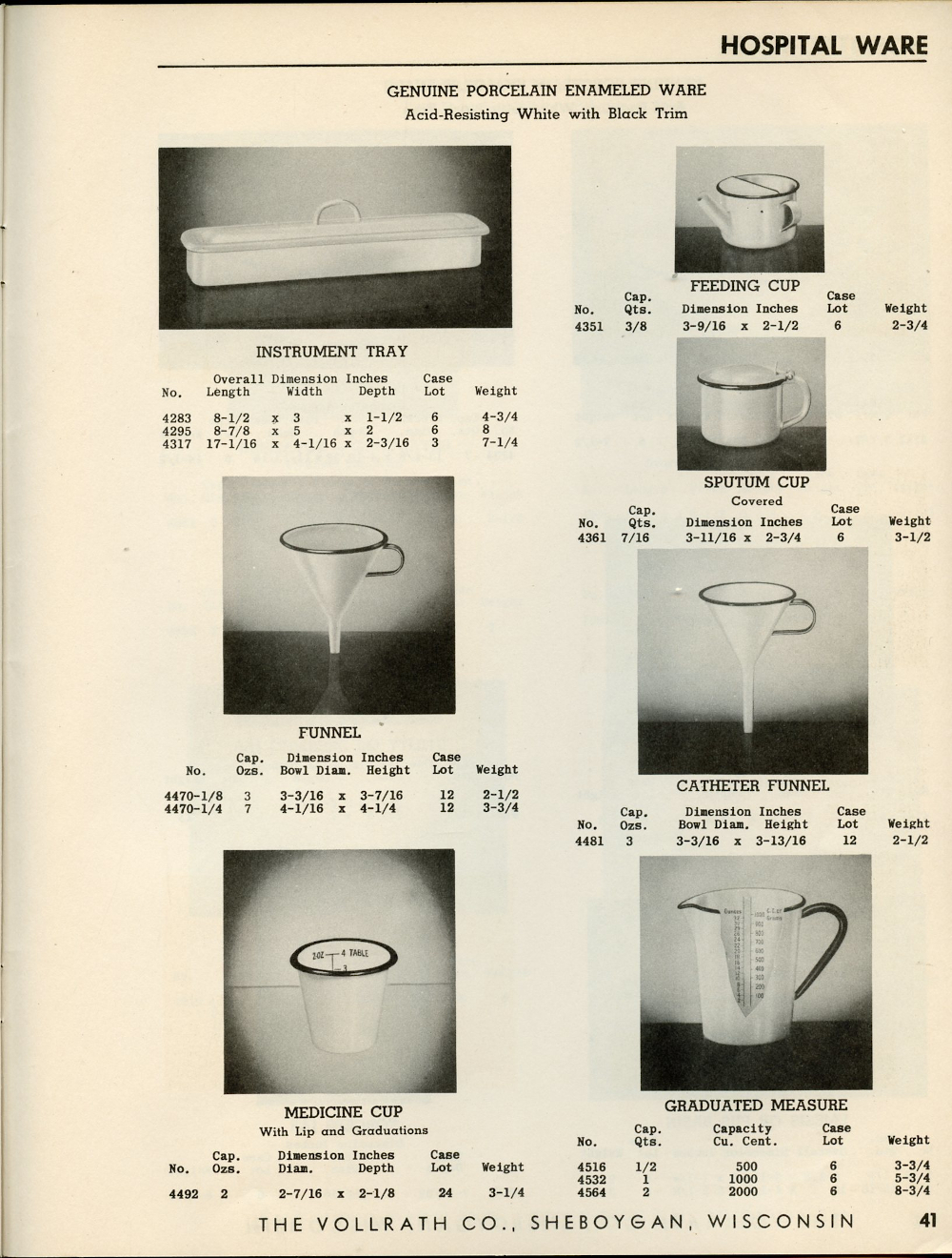 1950 Vollrath Catalog 75R Page 41: Instrument Tray, Feeding Cup, Sputum Cup, Funnel, Catheter Funnel, Medicine Cup, Graduated Measure.
