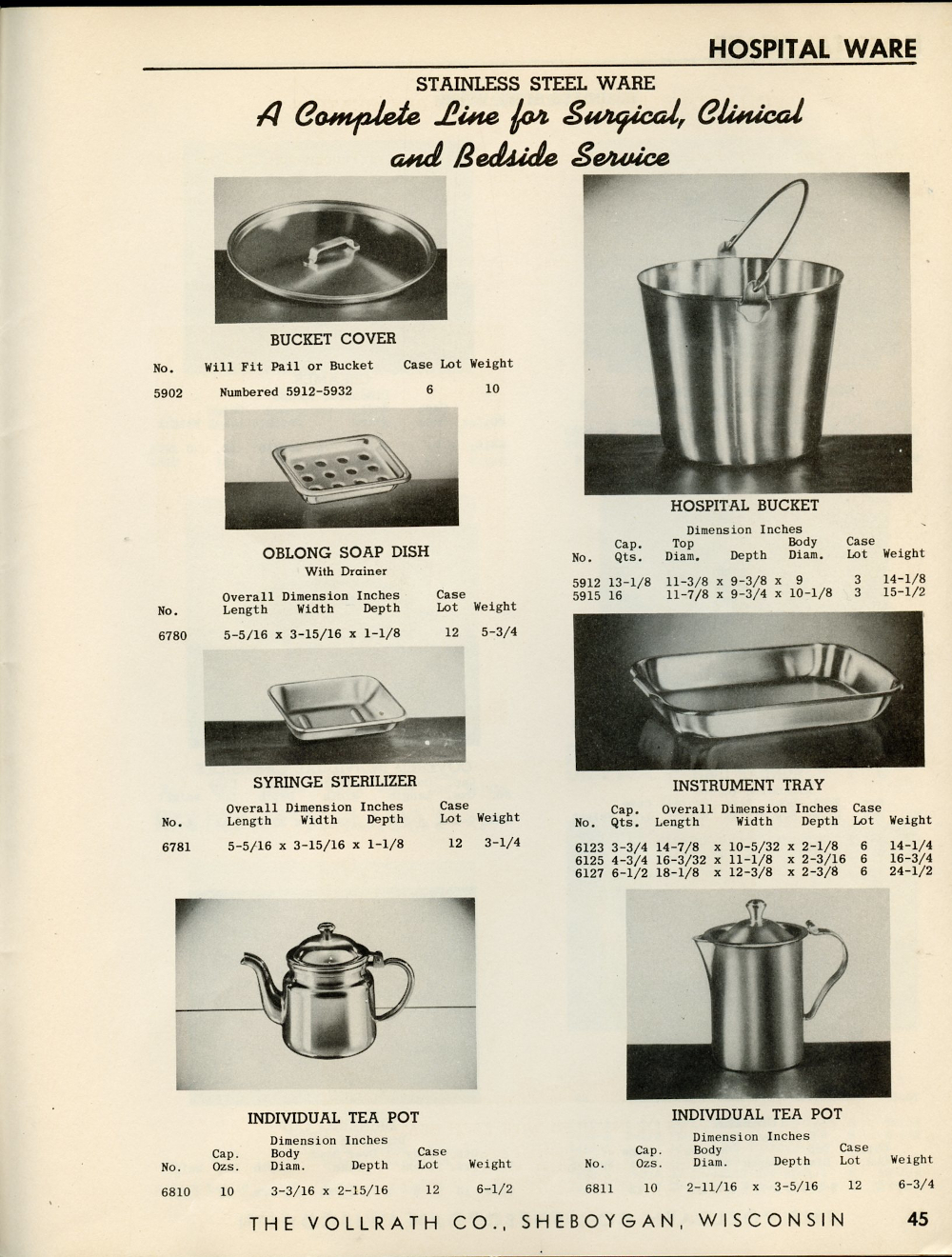 1950 Vollrath Catalog 75R Page 45: Bucket Cover, Oblong Soap Dish, Syringe Sterilizer, Individual Tea Pot, Hospital Bucket, Instrument Tray.