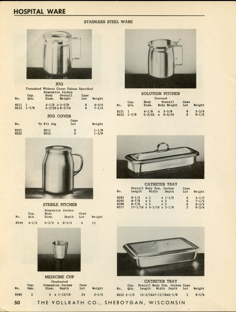 1950 Vollrath Catalog 75R Page 50: Jug, Jug Cover, Solution Pitcher, Sterile Pitcher, Catheter Tray, Medicine Cup.