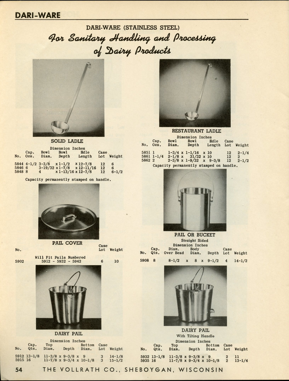 1950 Vollrath Catalog 75R Page 54: Solid Ladle, Restaurant Ladle, Pail Cover, Pail or Bucket, Dairy Pail.