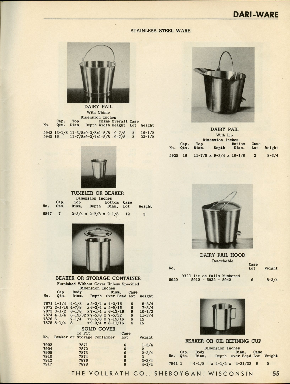 1950 Vollrath Catalog 75R Page 55: Dairy Pail, Dairy Pail Hood, Tumbler or Beaker, Beaker or Storage Container, Solid Cover, Beaker or Oil Refining Cup.