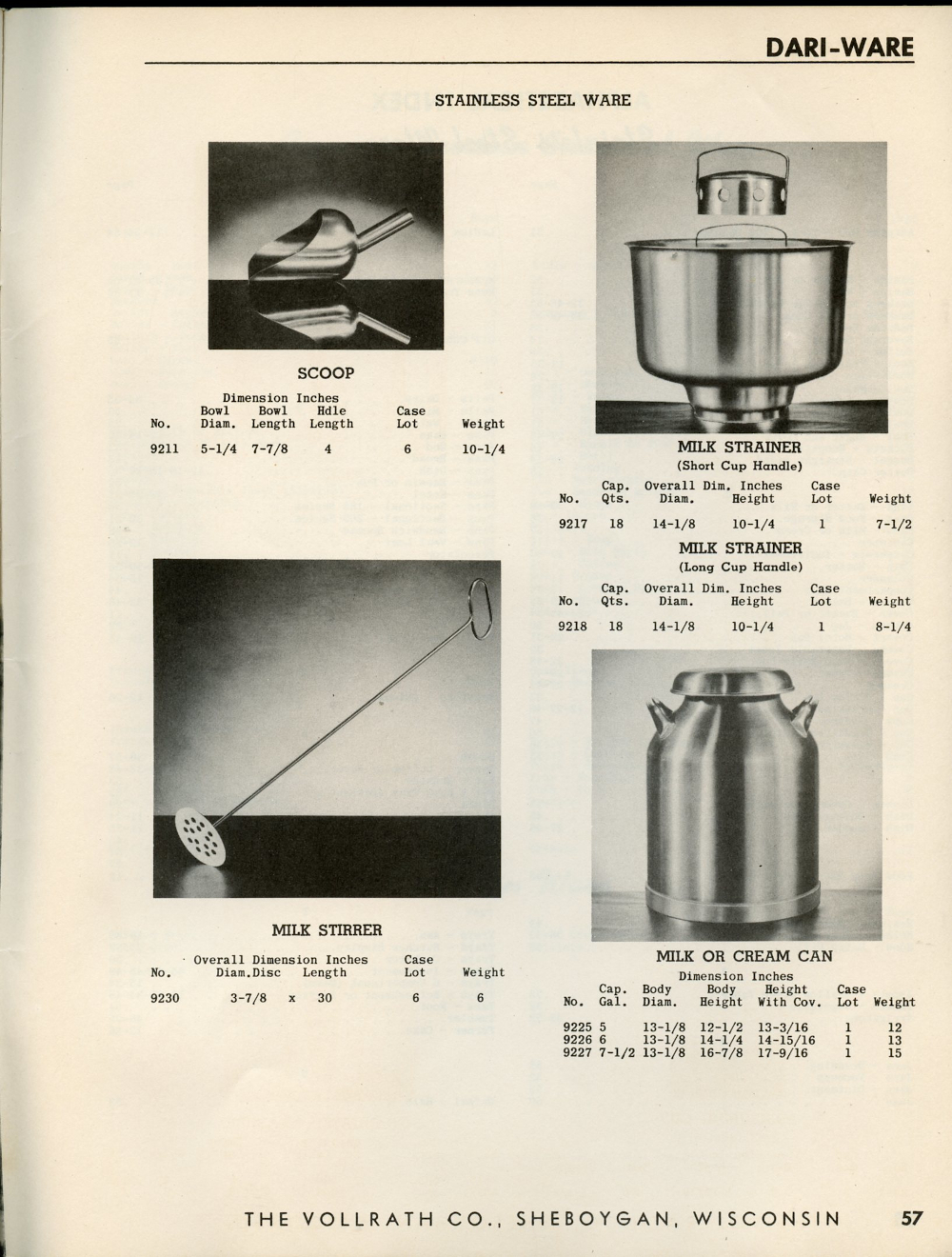 1950 Vollrath Catalog 75R Page 57: Scoop, Milk Strainer, Milk Stirrer, Milk or Cream Can.