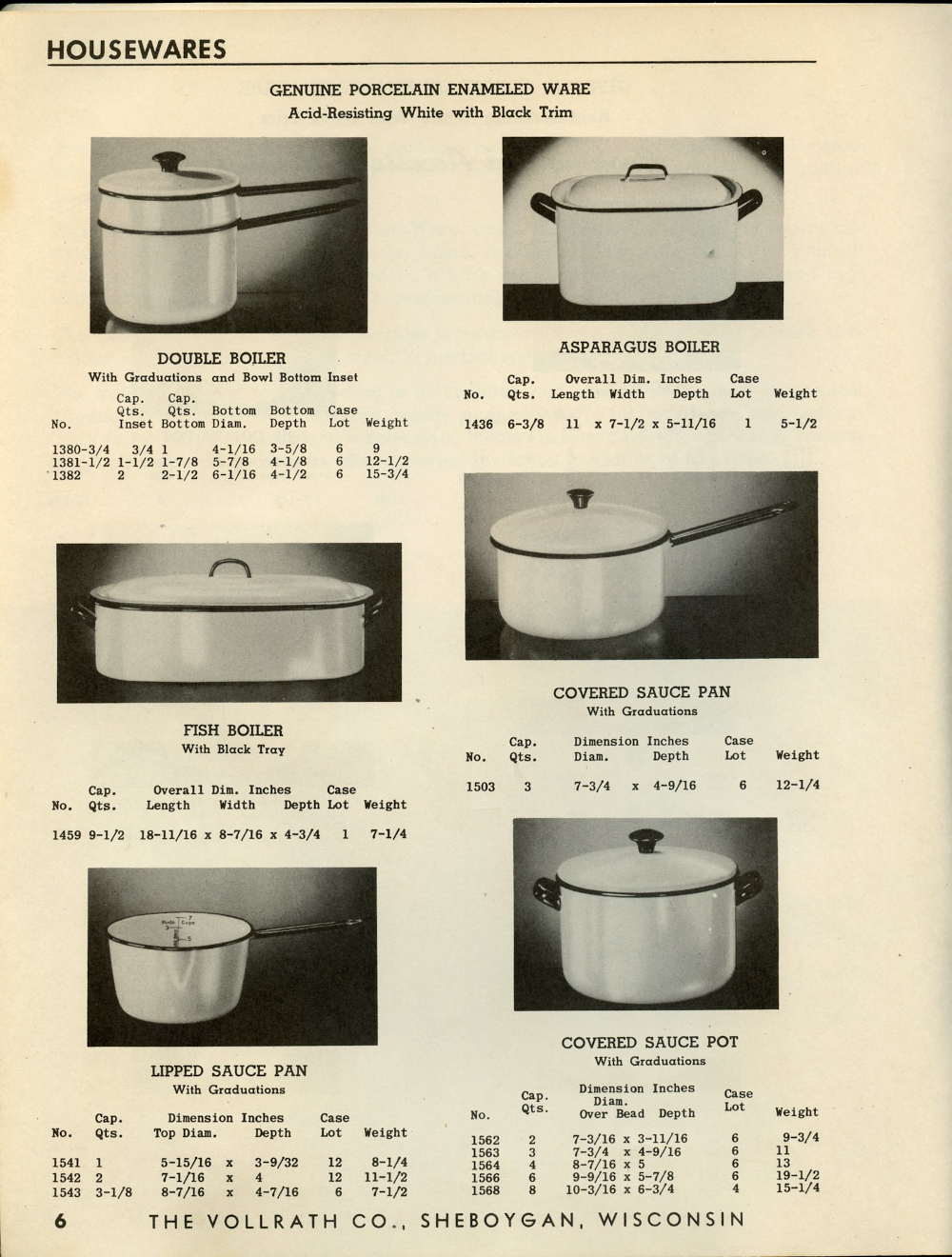 1950 Vollrath Catalog 75R Page 6: Double Boiler, Asparagus Boiler, Fish Boiler, Covered Sauce Pan, Lipped Sauce Pan, Covered Sauce Pot.