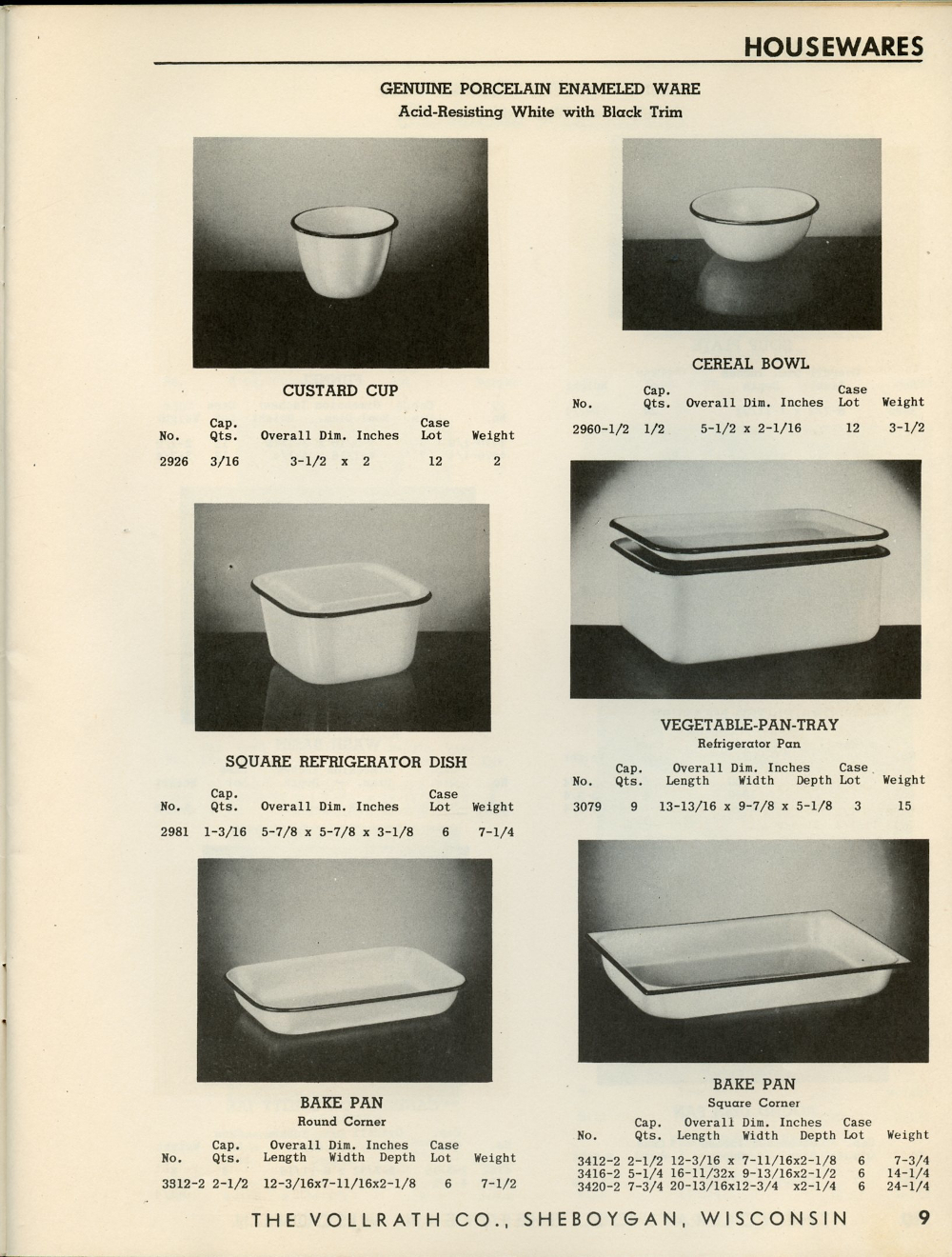 1950 Vollrath Catalog 75R Page 9: Custard Cup, Cereal Bowl, Square Refrigerator Dish, Vegetable-Pan-Tray, Bake Pan.
