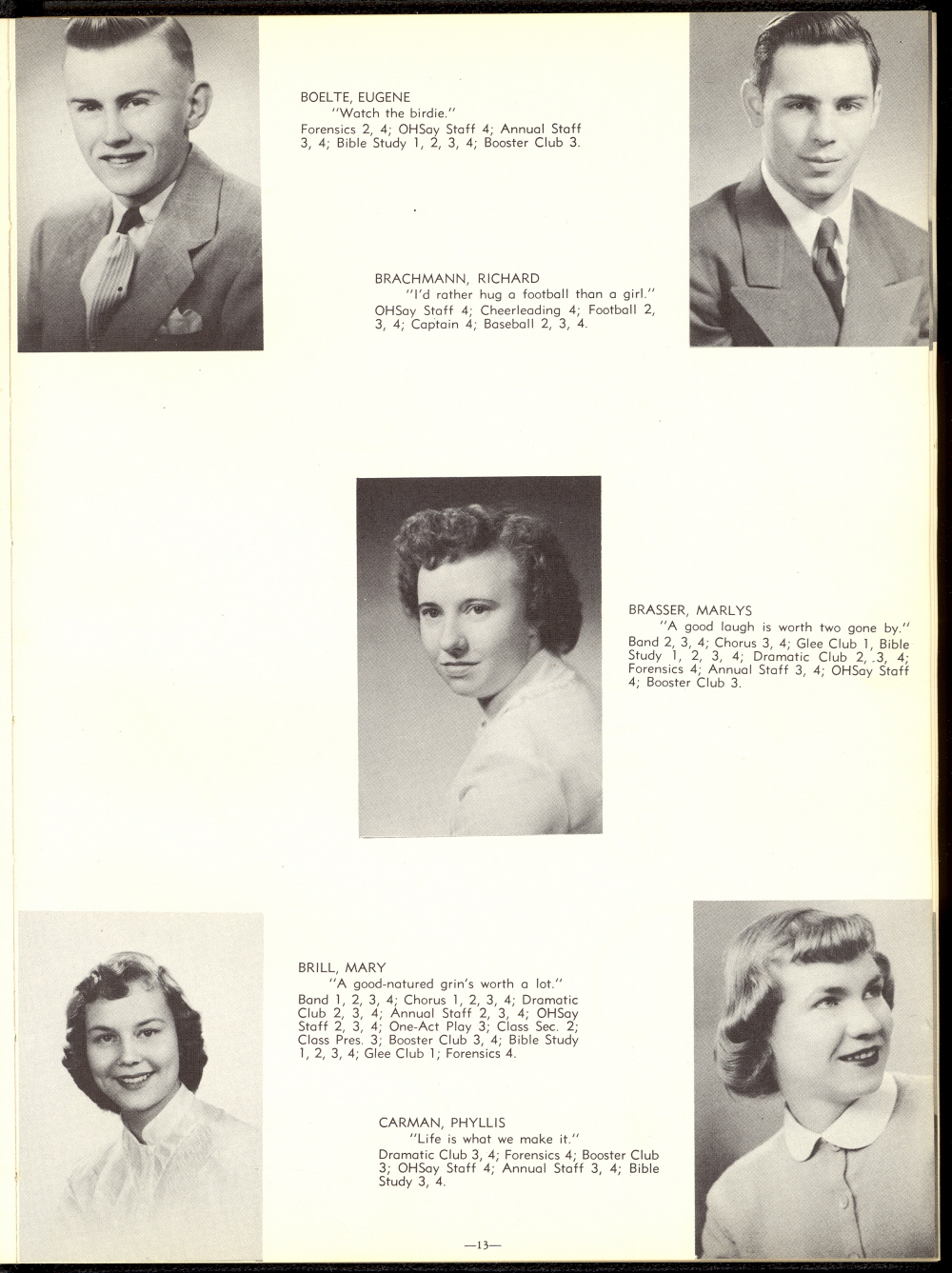 1951 Oostburg High School, Page 13: Eugene Boelte, Richard Brachmann, Marlys Brasser, Mary Brill, Phyllis Carman.