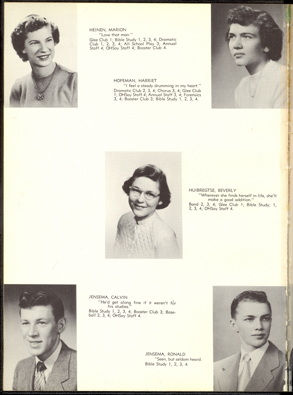 1951 Oostburg High School, Page 16: Marion Heinen, Harriet Hopeman, Beverly Huibregtse, Calvin Jensema, Ronald Jensema.