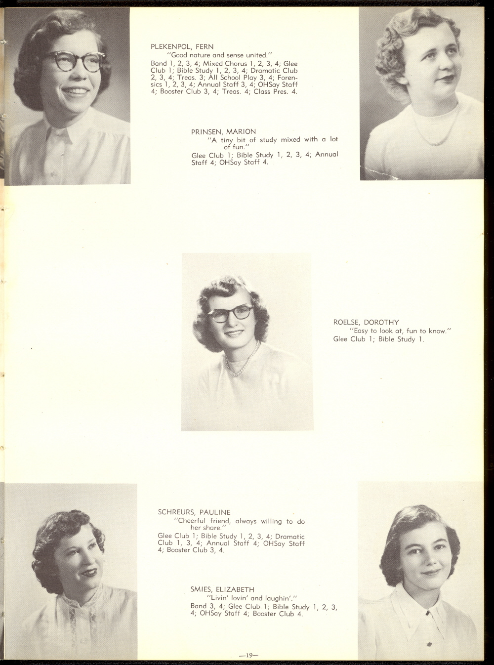 1951 Oostburg High School, Page 19: Fern Plekenpol, Marion Prinsen, Dorothy Roelse, Pauline Schreurs, Elizabeth Smies.