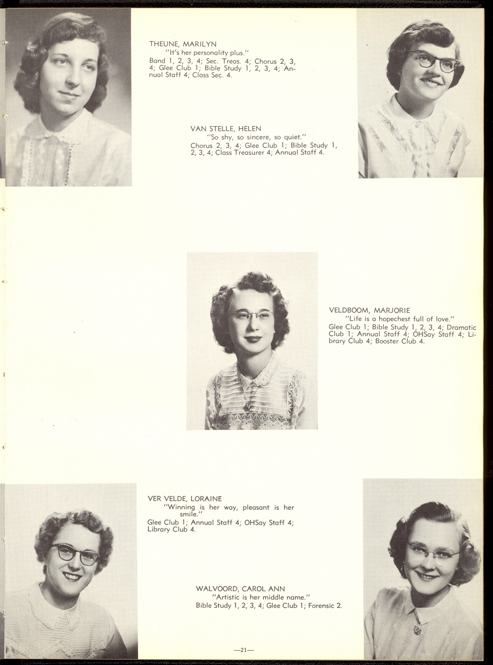 1951 Oostburg High School, Page 21: Marilyn Theune, Helen Van Stelle, Marjorie Veldboom, Loraine Ver Velde, Carol Ann Walvoord.