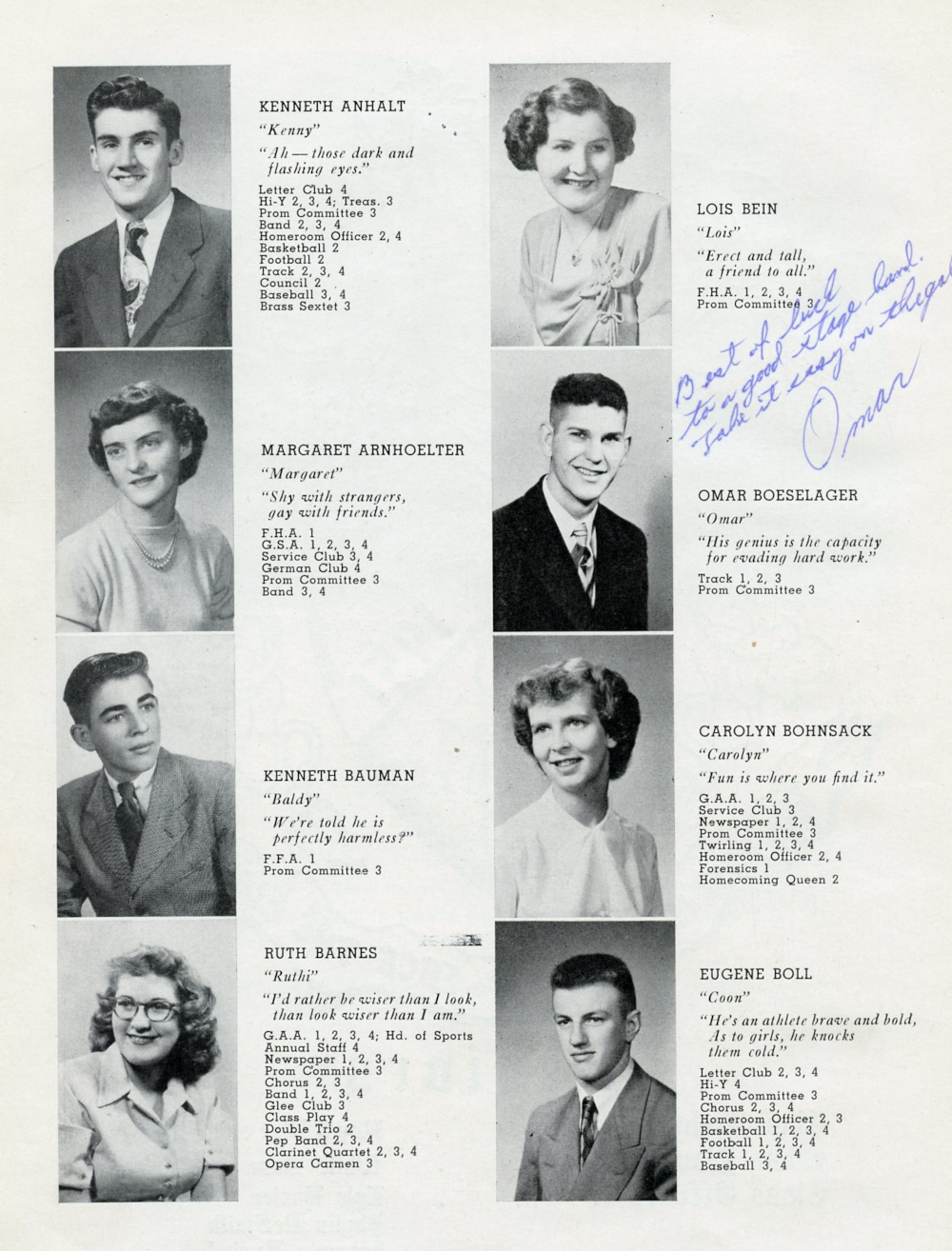 1951 Plymouth High School Yearbook Page 18: Kenneth Anhalt, Margaret Arnhoelter, Kenneth Bauman, Ruth Barnes, Lois Bein, Omar Boeselager, Carolyn Bohnsack, Eugene Boll.