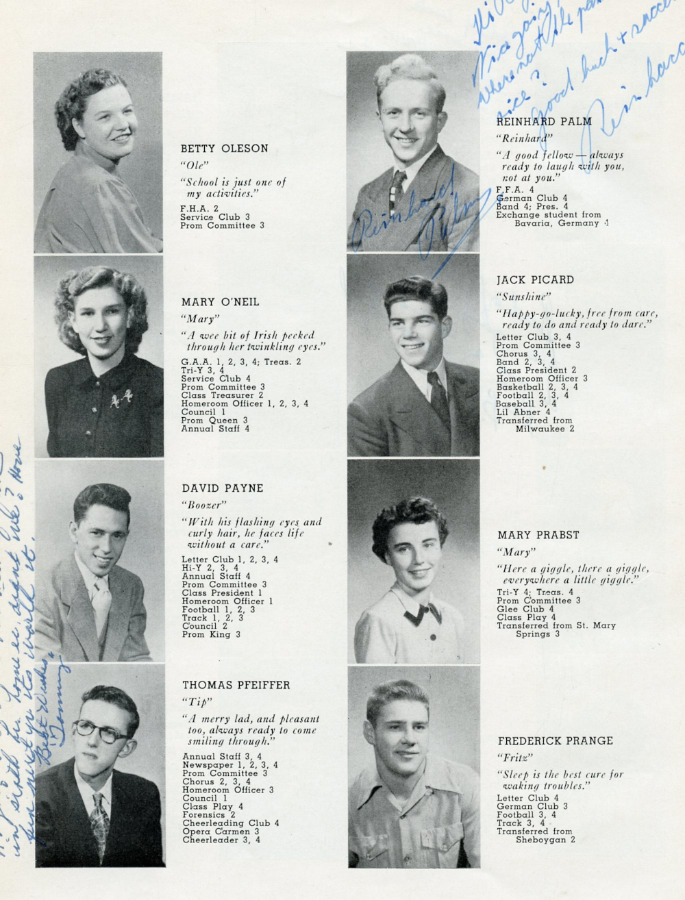 1951 Plymouth High School Yearbook Page 24: Betty Oleson, Mary O'Neil, David Payne, Thomas Pfeiffer, Reinhard Palm, Jack Picard, Mary Prabst, Frederick Prange.